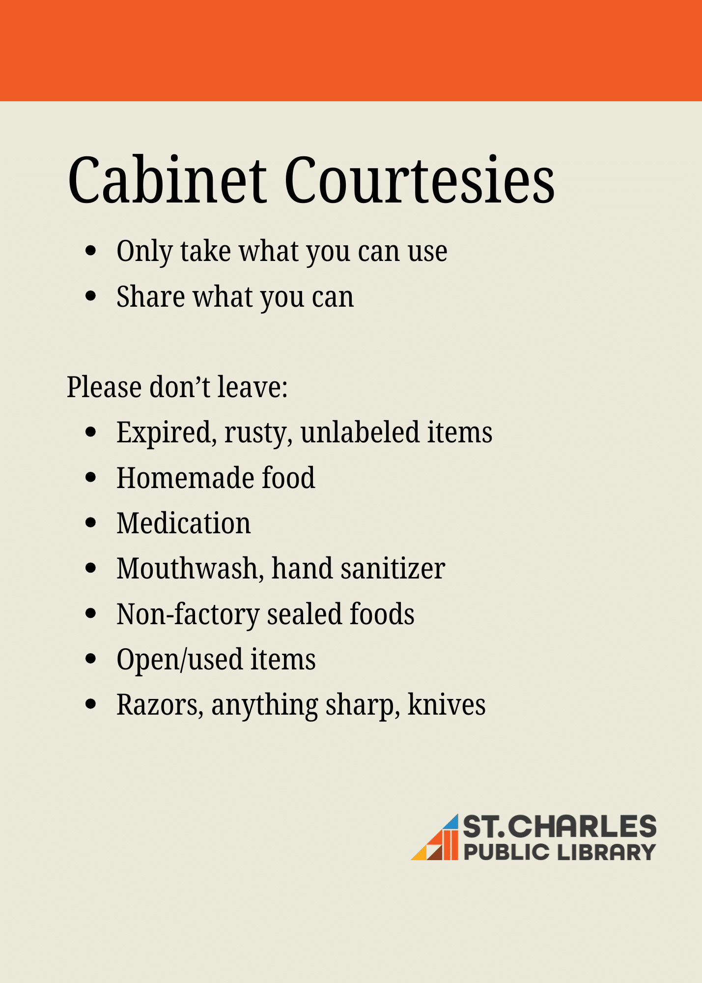 The St. Charles Public Library Community Cabinet provides nonperishable goods to anyone in need. Built by Aiden Miller as an Eagle Scout project, the pantry opened in February 2025 and is available during library hours.